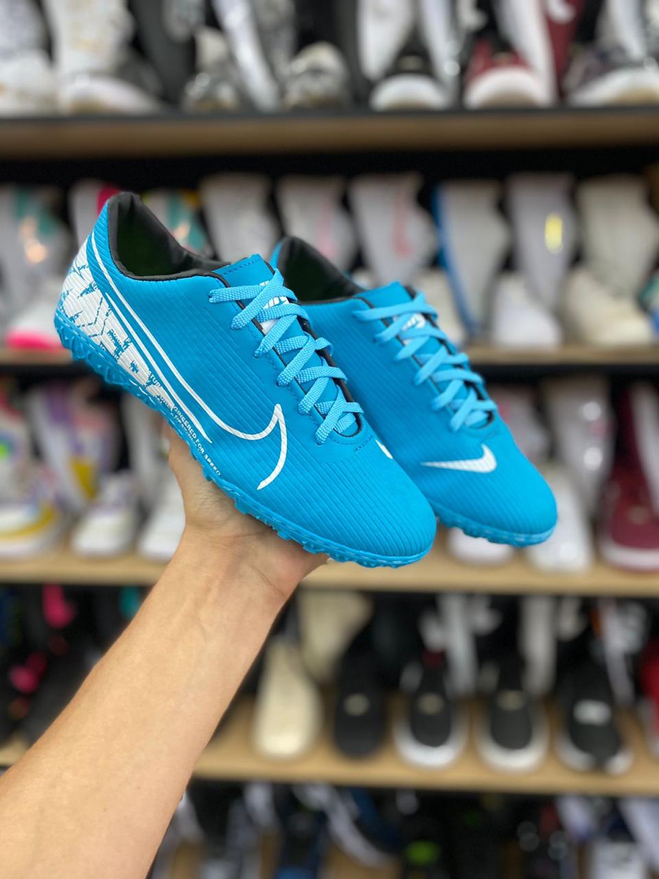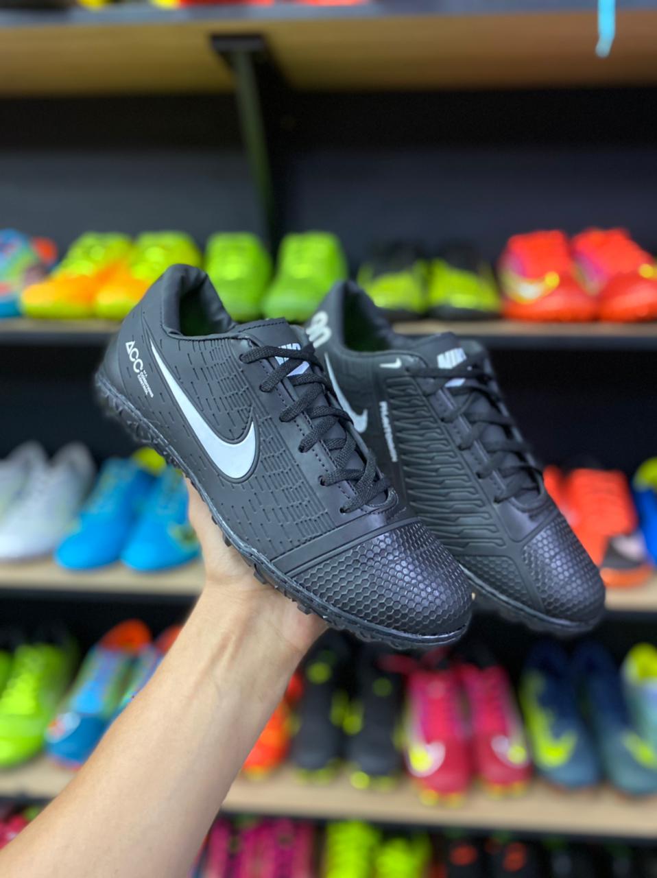 Solado em [Material do Solado, ex: borracha com tecnologia antiderrapante]: Garante tração superior em gramados sintéticos, permitindo movimentos ágeis e mudanças de direção rápidas e seguras.